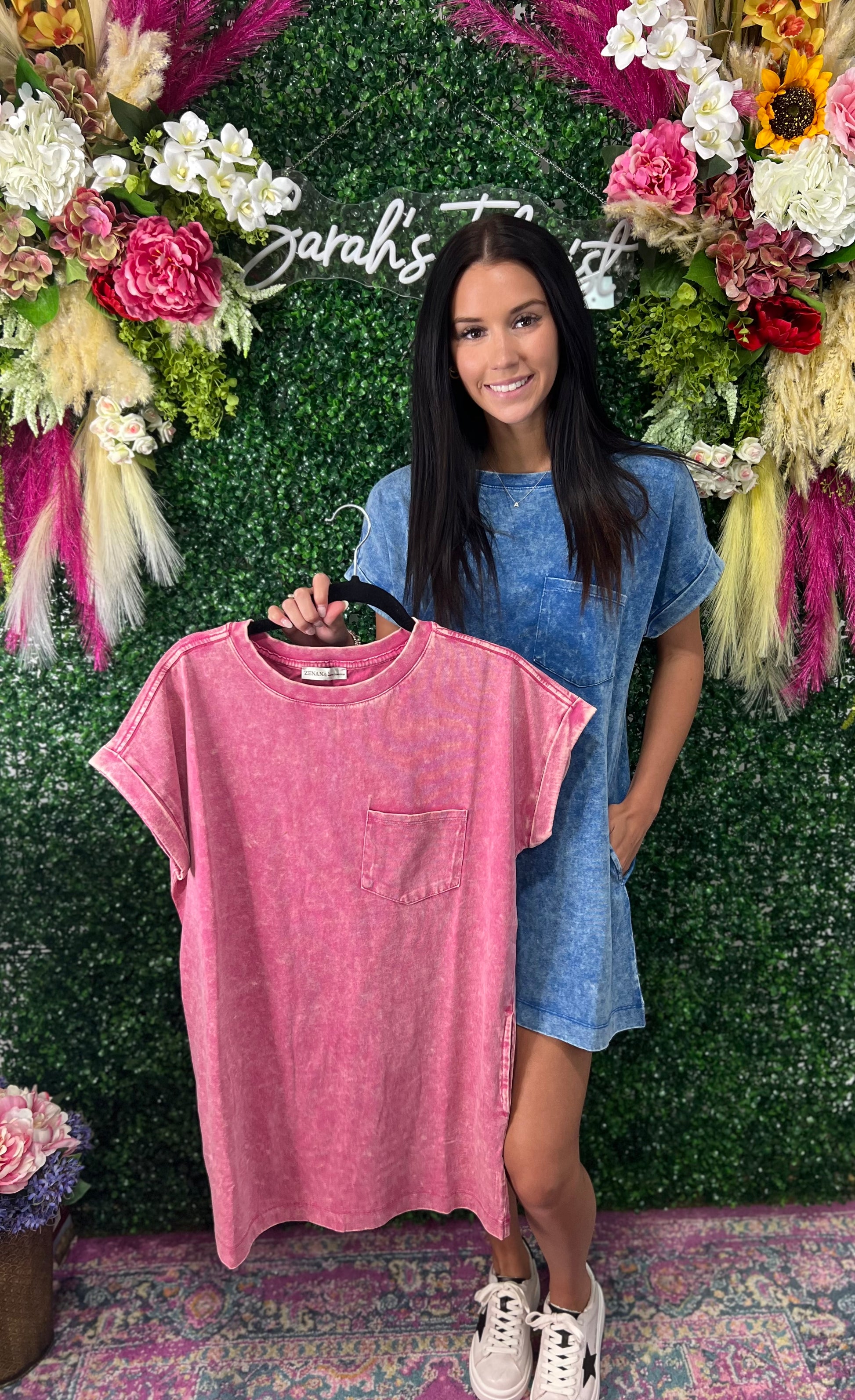 Stay stylish and cool this summer in our PINK Desert Bloom midi dress. Made from a beautiful pink acid washed fabric, this dress is perfect for any occasion. With the added convenience of pockets, you can easily carry your essentials while looking effortlessly chic.