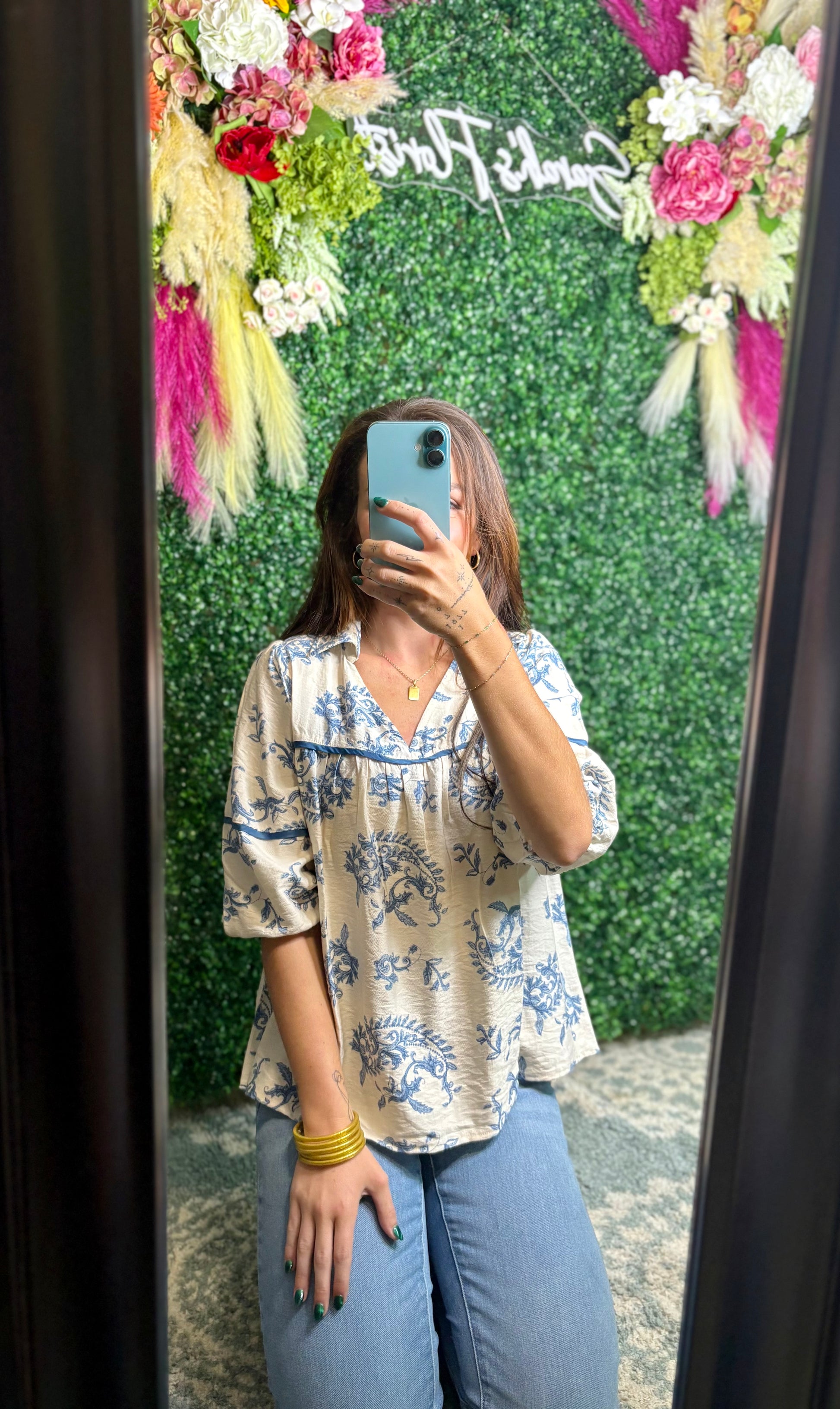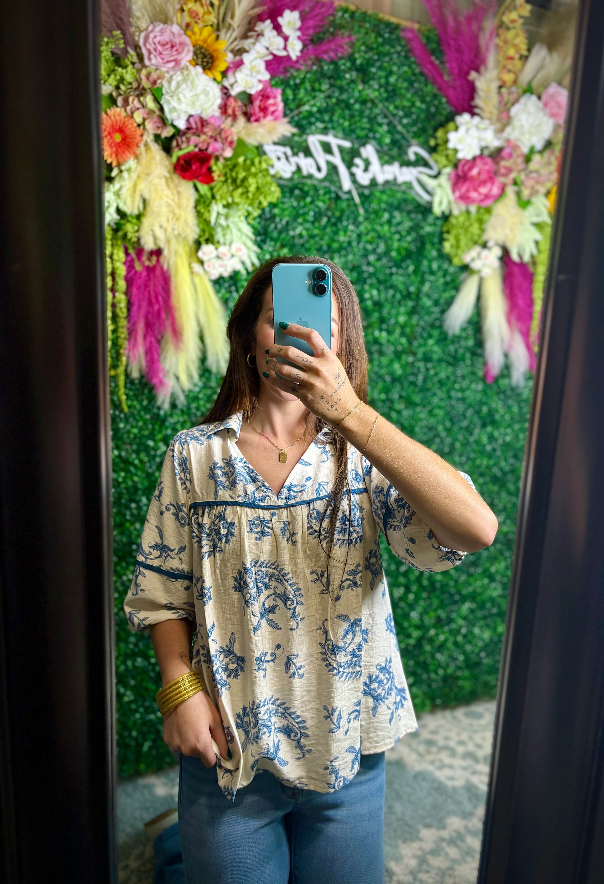 Elevate your wardrobe with our Ink & Ivory Top. This cream blouse features a beautiful blue print, adding a touch of elegance to any outfit. Made from high-quality materials, it's both comfortable and stylish. Perfect for both work and play, this top is a must-have for any fashion-forward individual.
