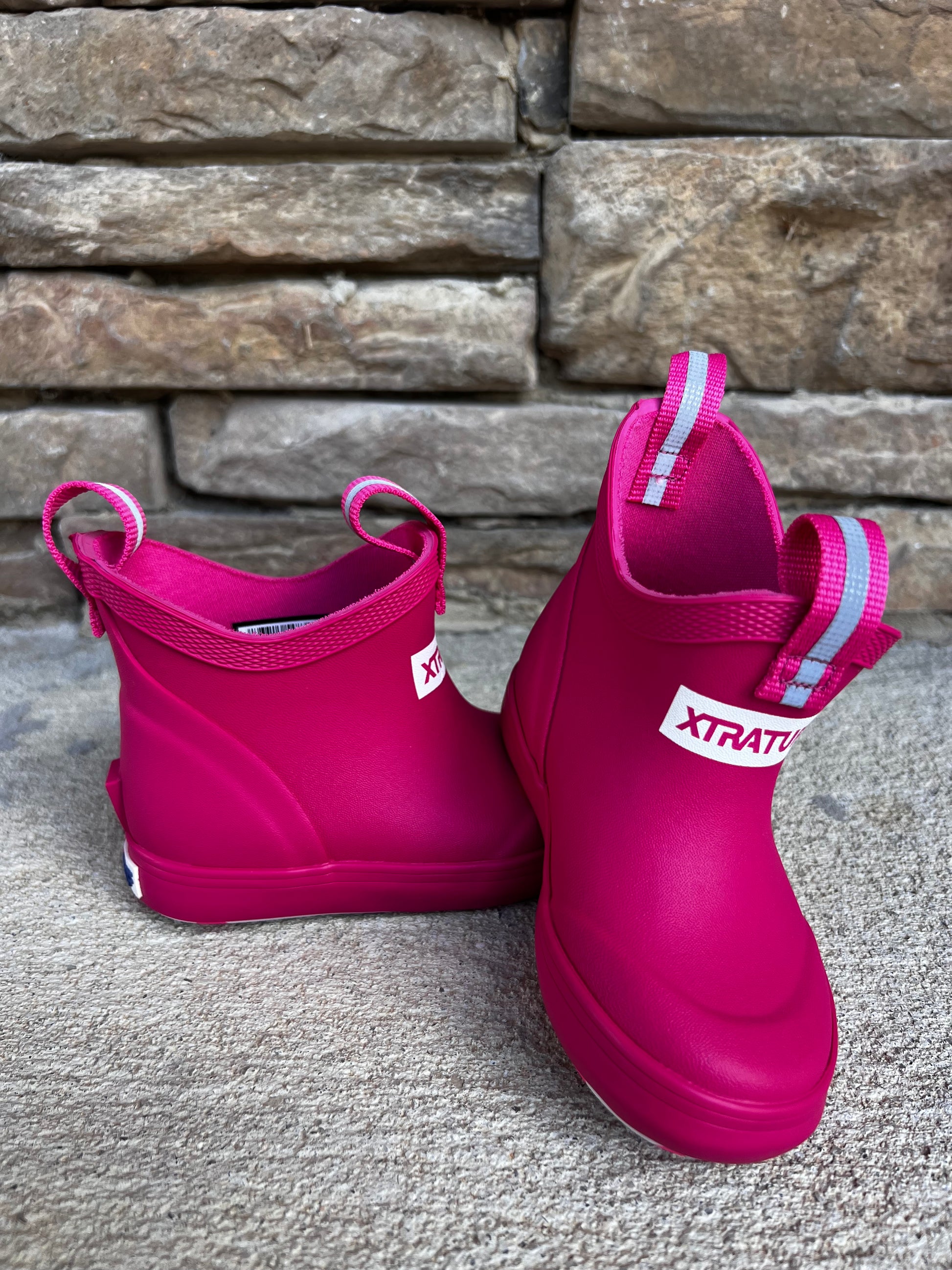 These toddler boots are perfect for little ones who love to play outside. Made with Xtra Tuff material, they are durable and suitable for any adventure. The neon pink color adds a fun touch, while the ankle length provides added support. Keep your child's feet comfortable and protected with these high-quality boots.